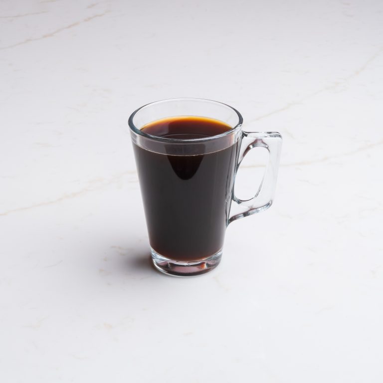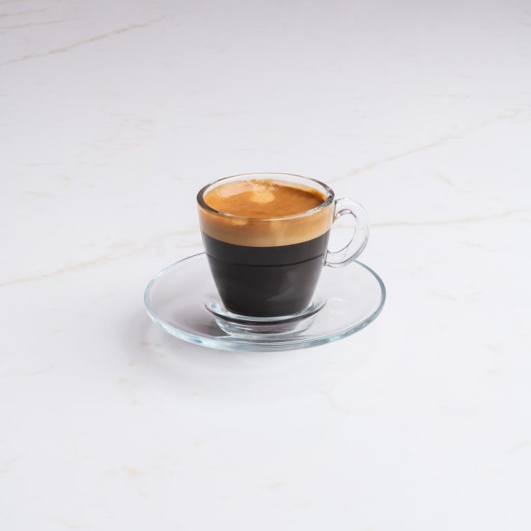 A double shot of espresso, proud, using twice the amount of ground coffee as a single shot, but pulled with the same precision and timing