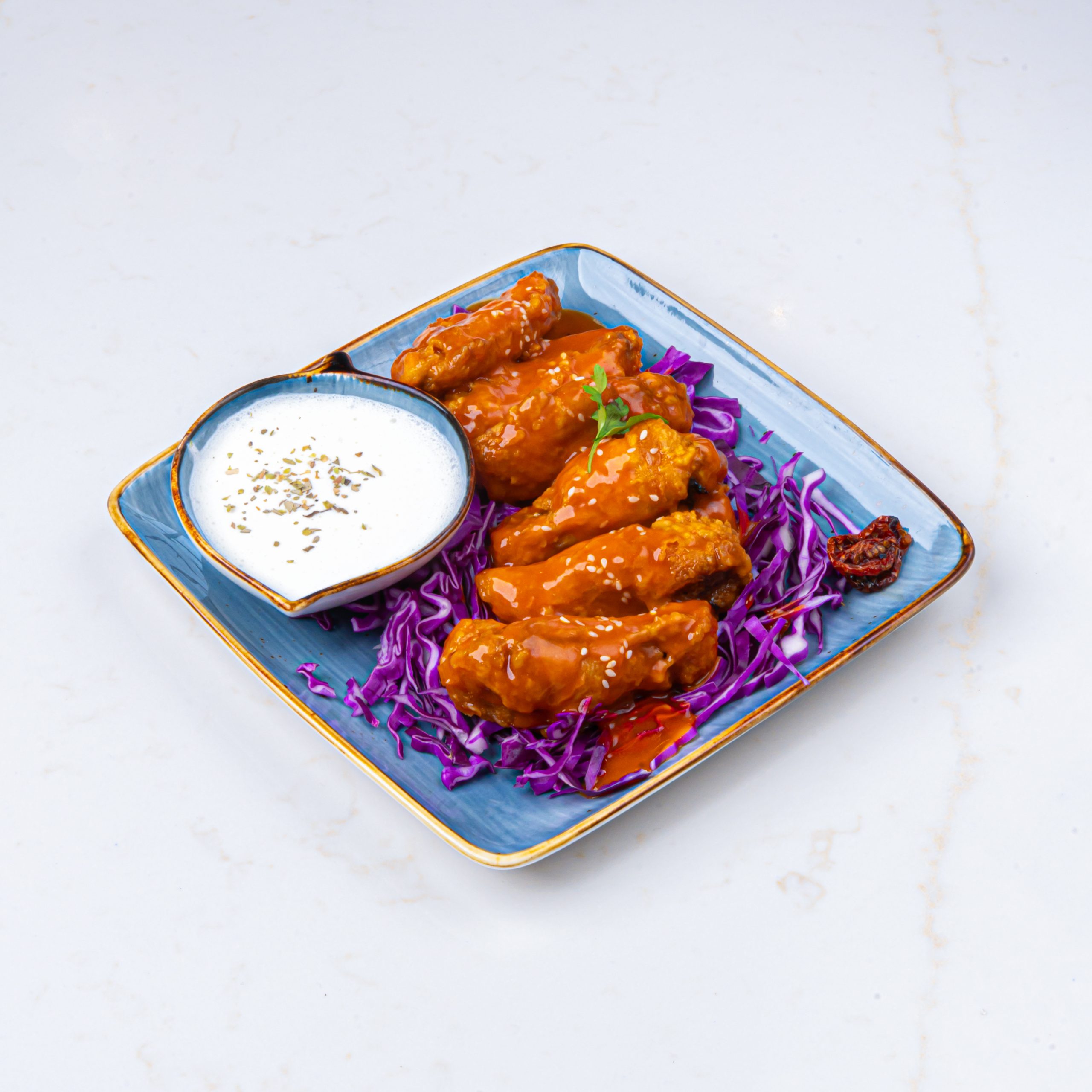 أجنحة بوفالو الحارة التي تتميز بأجنحة دجاج مقرمشة مغطاة بصوص بوفالو الحار، تُقدّم مع صوص القشدة الحامضة الباردة للتغميس، مثالية كوجبة خفيفة أو مقبلات مليئة بالنكهة.
