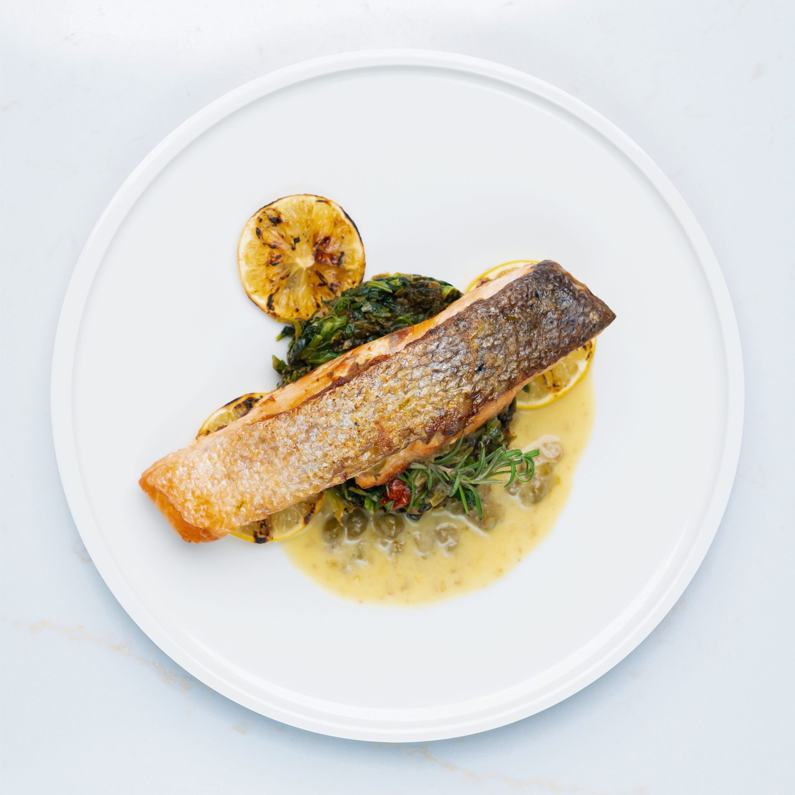 Pan-seared salmon Perfectly cooked salmon fillet with a crispy skin, served overs gently sauteed garlic spinach. Simplest healthy, complementary flavors Finished with a lemon wedge for a bright fresh.