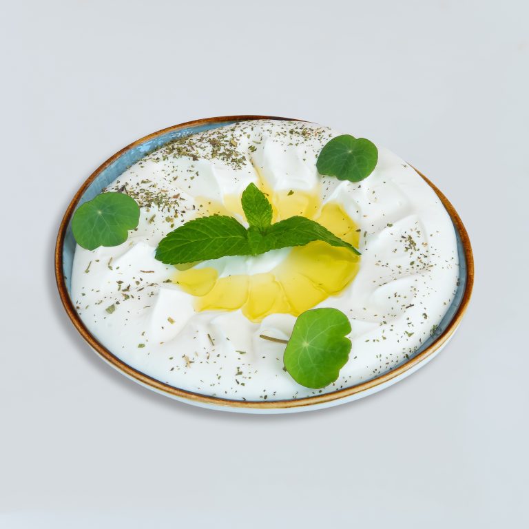 A delightful plate of Lubna, a creamy and tangy yogurt dip, drizzled with rich olive oil.
