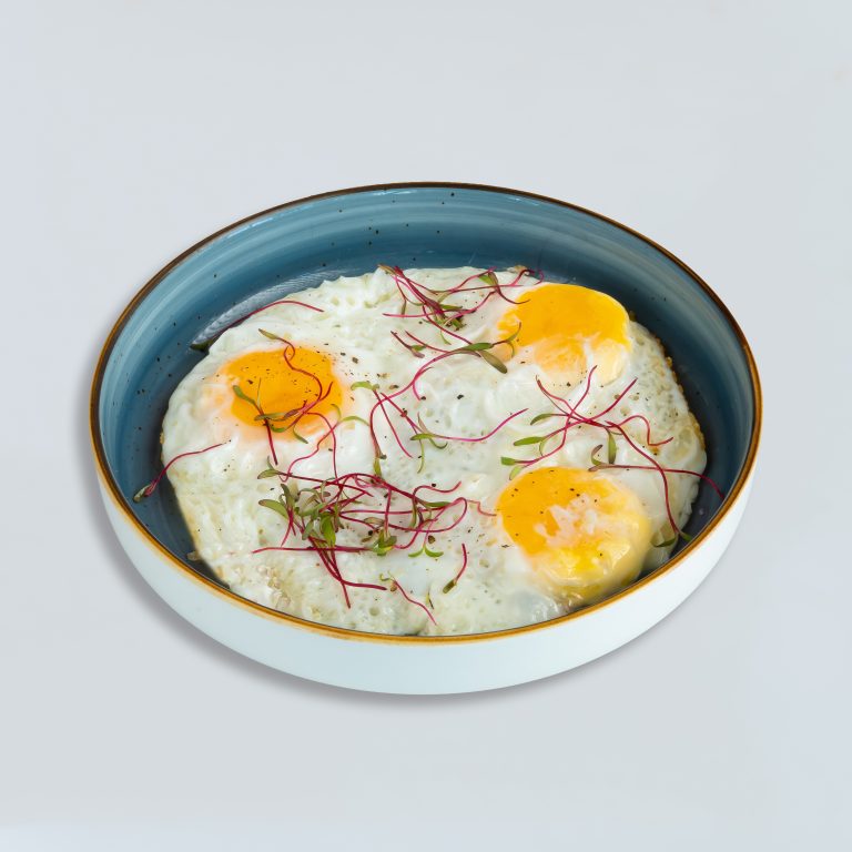 Perfectly cooked sunny side up eggs with a runny yolk.