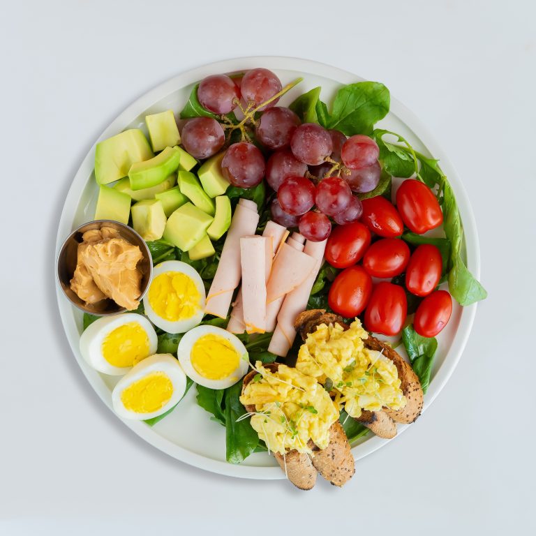 A wholesome plate featuring boiled eggs, creamy avocado, fresh tomatoes, arugula, a side of peanut butter, and a seasonal fruit salad, complemented by healthy oatmeal pancakes.