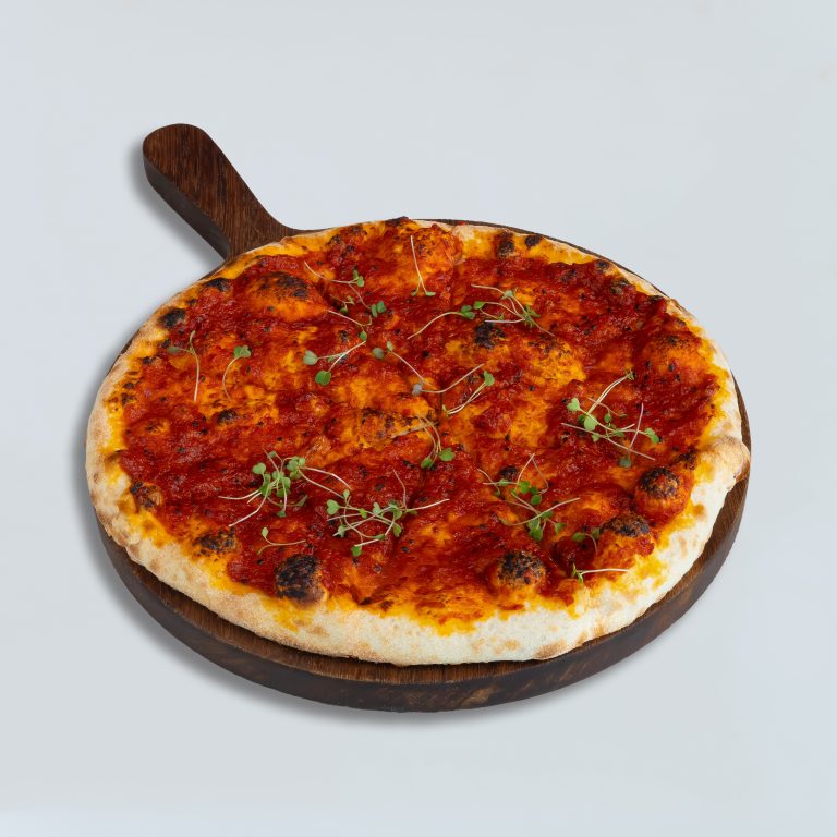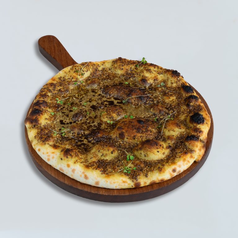 A flavorful large piece of Manakish topped with aromatic za’atar, a blend of herbs and spices, all baked to perfection on warm, soft flatbread.