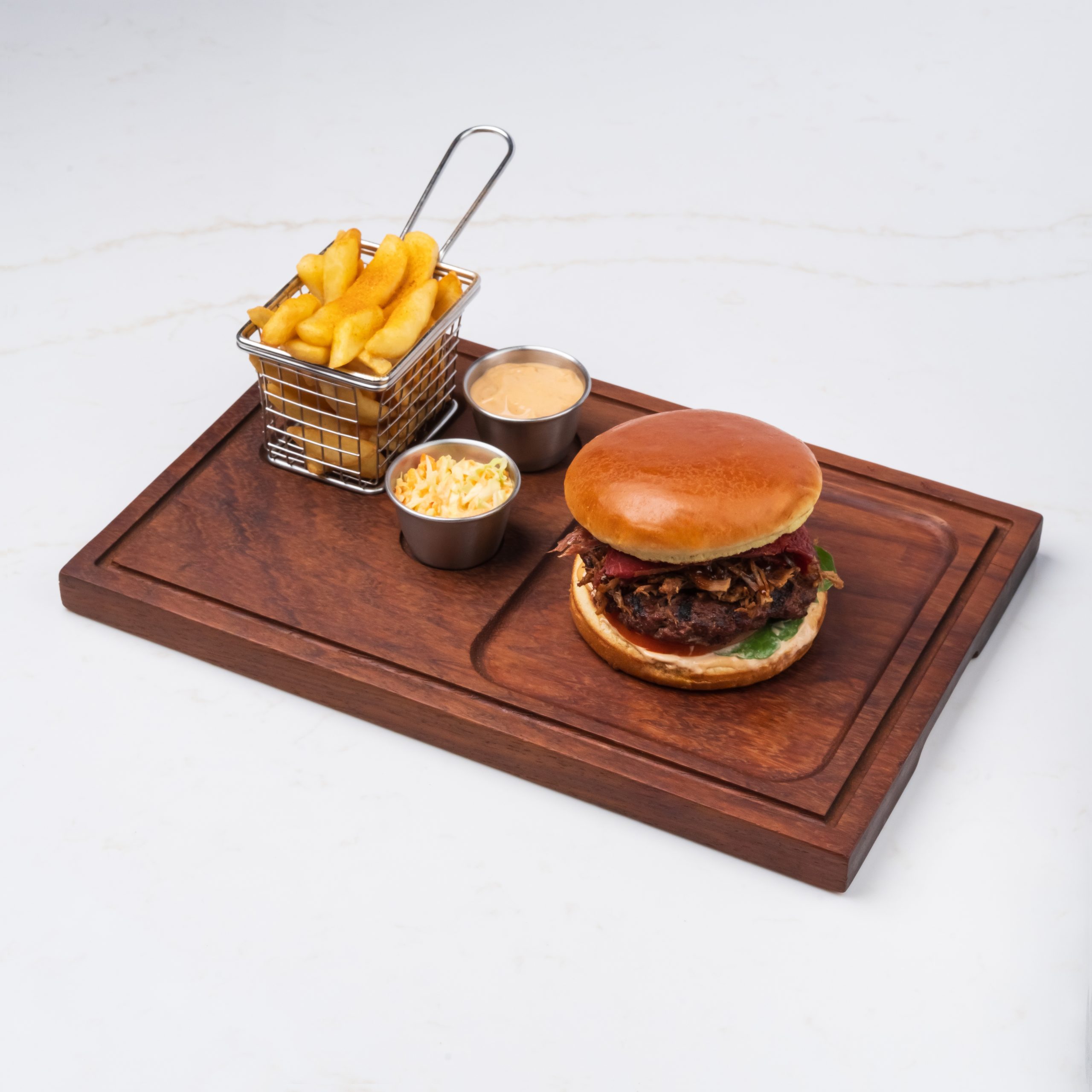 A gourmet Burger featuring a juicy beef patty topped with melted Emmental cheese, fresh tomato, crispy beef bacon, and savory beef brisket, finished with Rocca, smoked mayo, and smoky BBQ sauce for a flavorful and indulgent experience.