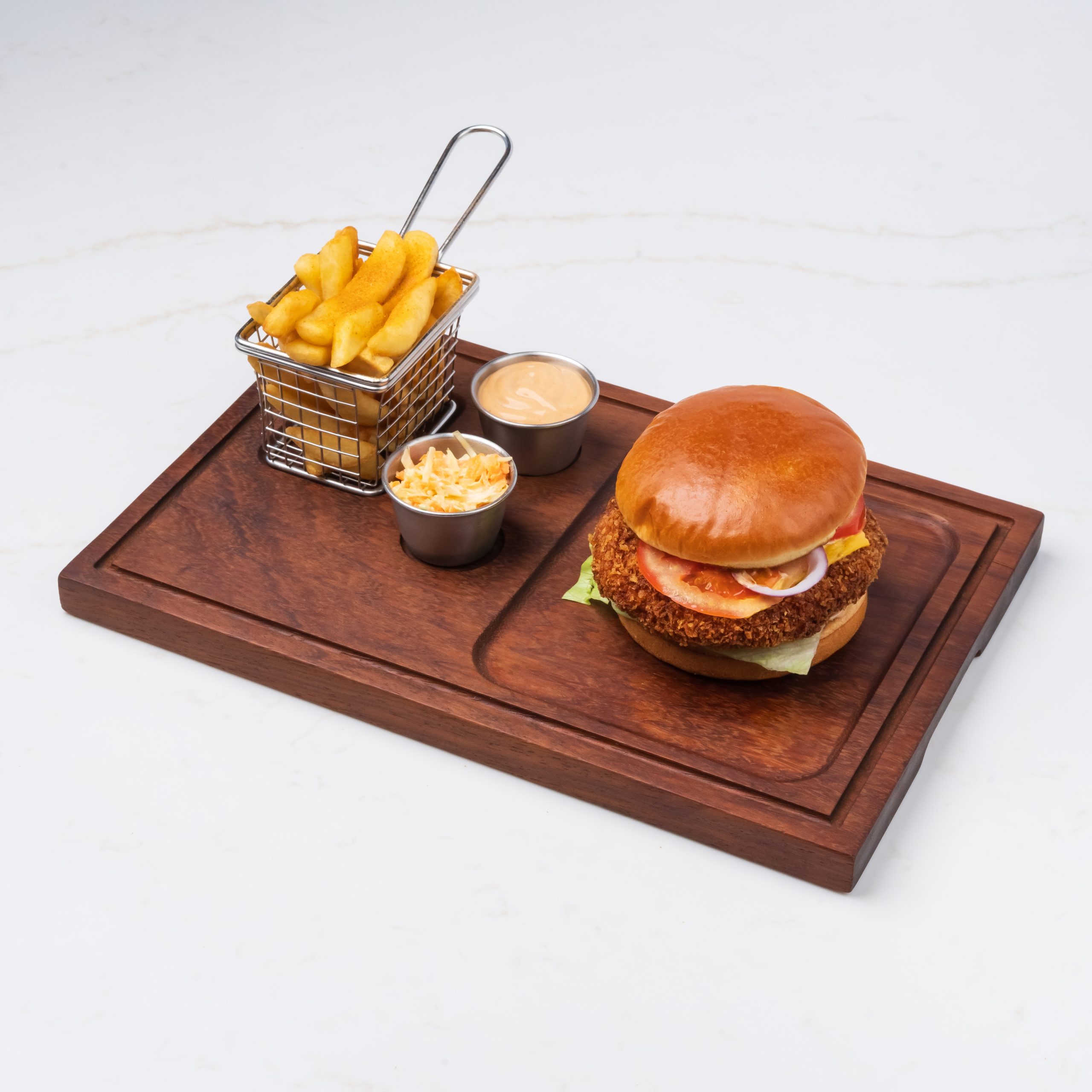 A satisfying Crunchy Chicken Burger featuring a crispy chicken breast, topped with fresh iceberg lettuce, tomato, cheddar cheese, and mac relish sauce, served with a side of fries.