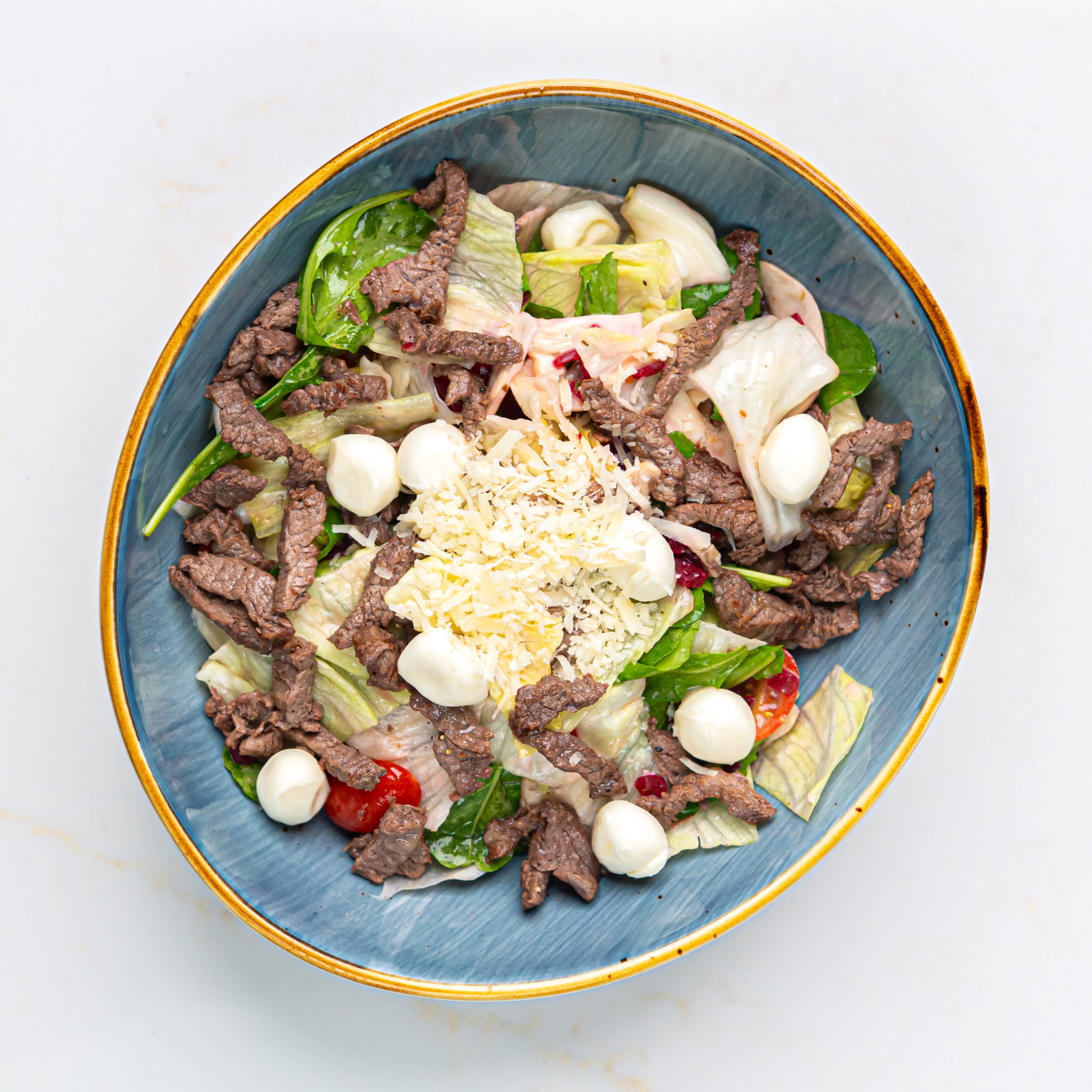A hearty Steak Salad featuring tender beef tenderloin served over a fresh mix of Rocca, iceberg lettuce, beetroot, mushrooms, and cherry tomatoes, topped with Parmesan and baby cheese for a satisfying and flavorful dish.